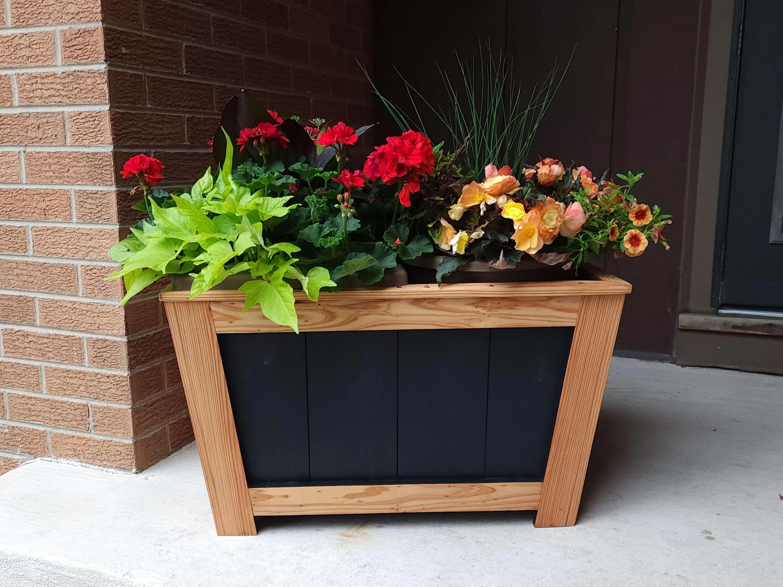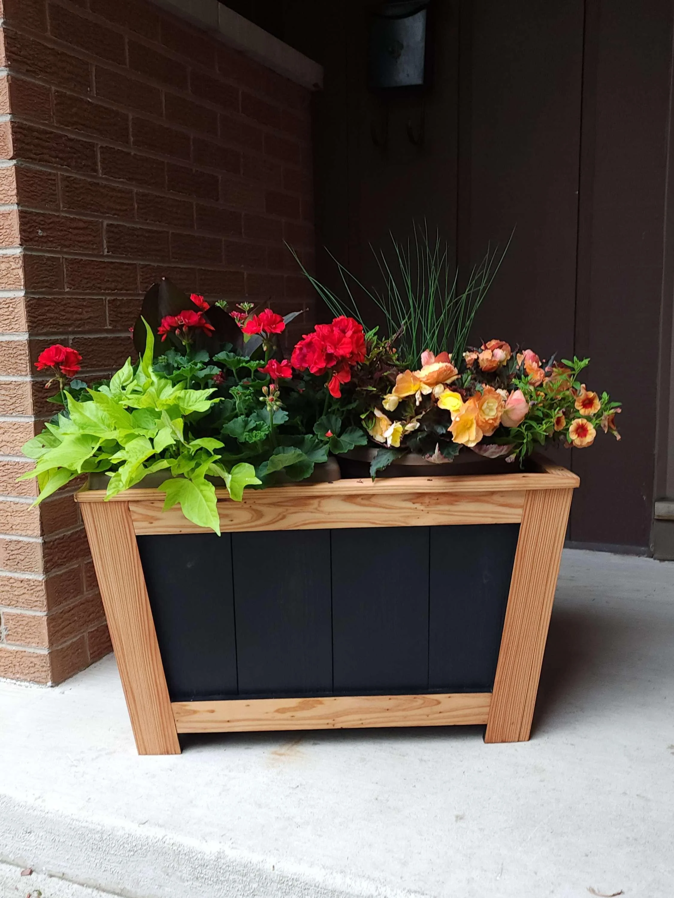 Our handcrafted 2-tone Black with Natural Cedar Planter Box offers a modern rustic aesthetic. Measuring L 26 3/4" x H 16 1/4"x W 15 3/4" it provides ample planting space for your favorite flowers or herbs. Meticulously crafted with smooth edges, this planter box showcases exceptional quality and durability. It's sealed with a protective coating to preserve the natural cedar and maintain vibrant colors. Whether you have a contemporary or rustic outdoor setting, this 2-tone planter box adds sophistication and charm, becoming a captivating focal point. Elevate your outdoor space with this stunning piece, blending modern design and rustic aesthetics perfectly