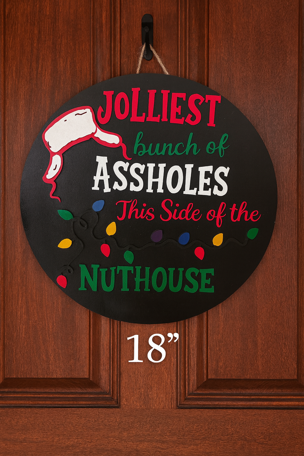 Jolliest Bunch of Assholes Door Hanger – 18" Funny Christmas Front Door Sign | Holiday Porch Décor | Birch Wood Layered Sign | Inspired by National Lampoon’s Christmas Vacation