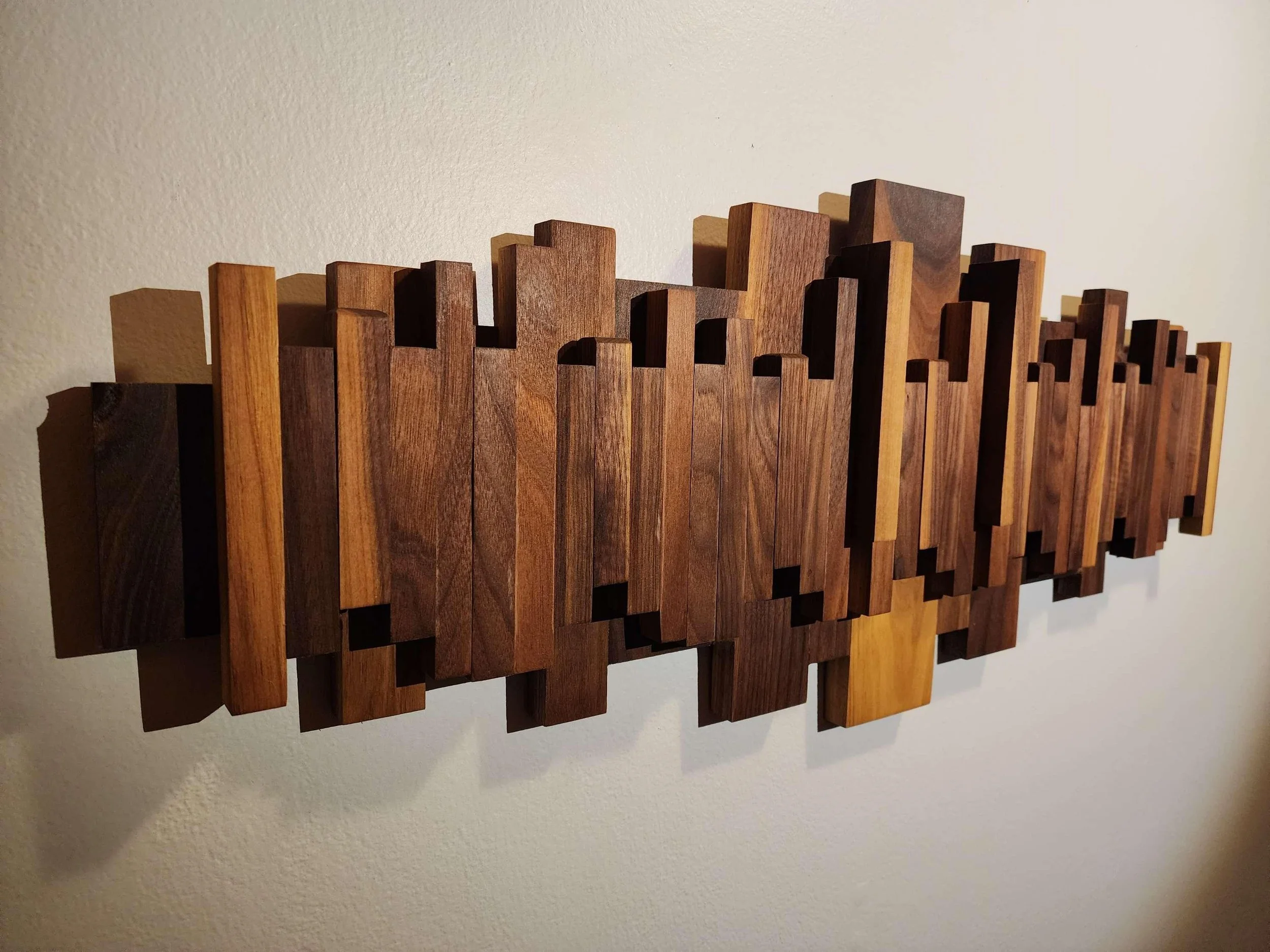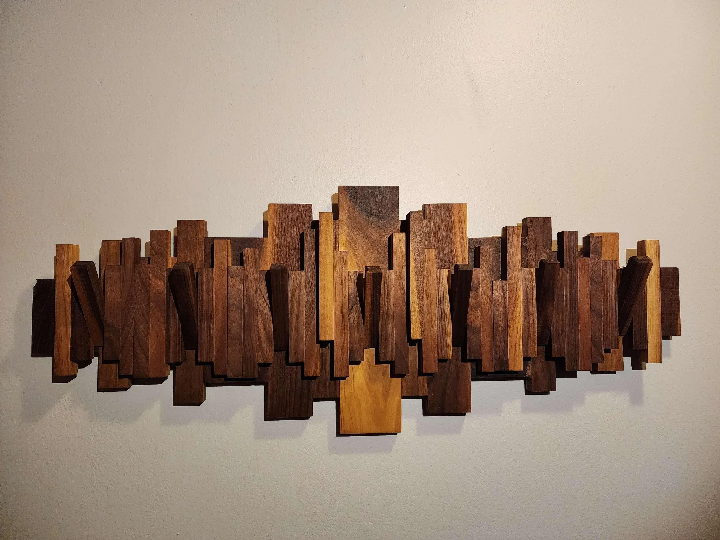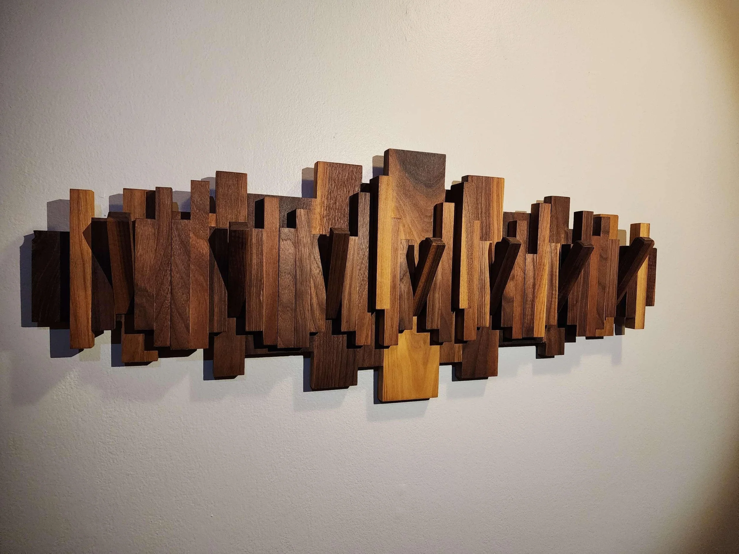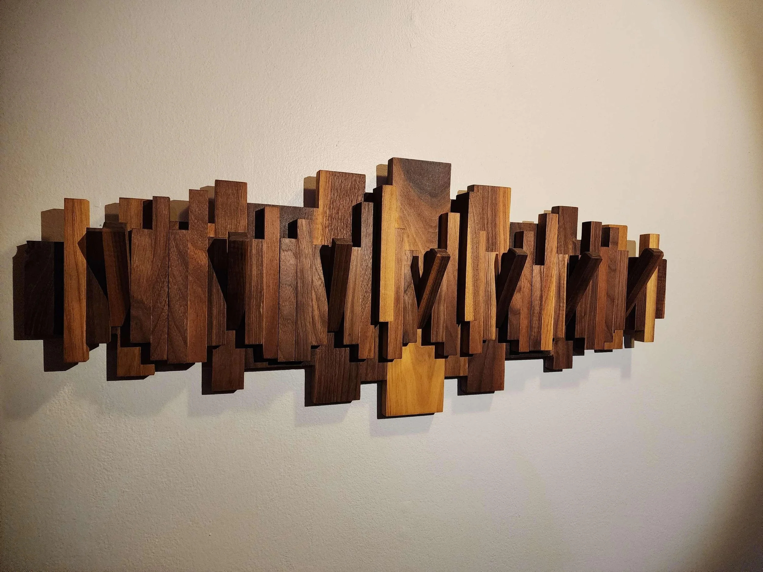 Handmade Modern Hanging Coat Rack. This is handcrafted art that is beautiful and also functional. Made out of all Walnut. Hand pick Walnut wood, milled down to various sizes, and cut to size. This piece starts out with a back piece approx 3/4" think, with various width sections all glued up together. Then depending on size of rack, certain pegs will flip out to hang items like jackets, hats, and anything you need to hang. When not in use, it's a decorative piece of art.