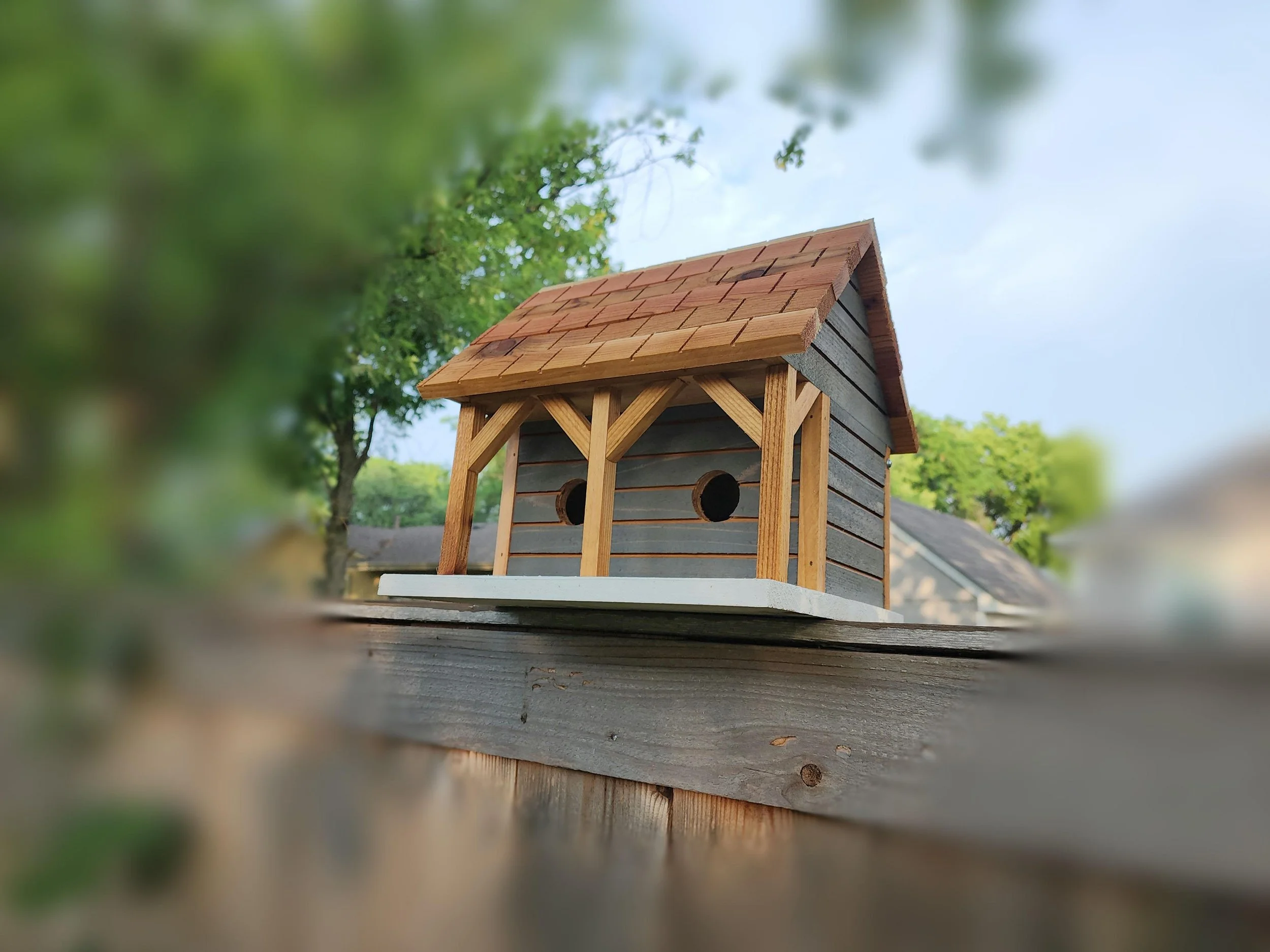 To further enhance its aesthetic appeal, the "Martini" Birdhouse features cedar posts that beautifully complement the overall design. The rich, natural hues of the wood infuse a touch of organic elegance, creating an eye-catching focal point in your outdoor space.