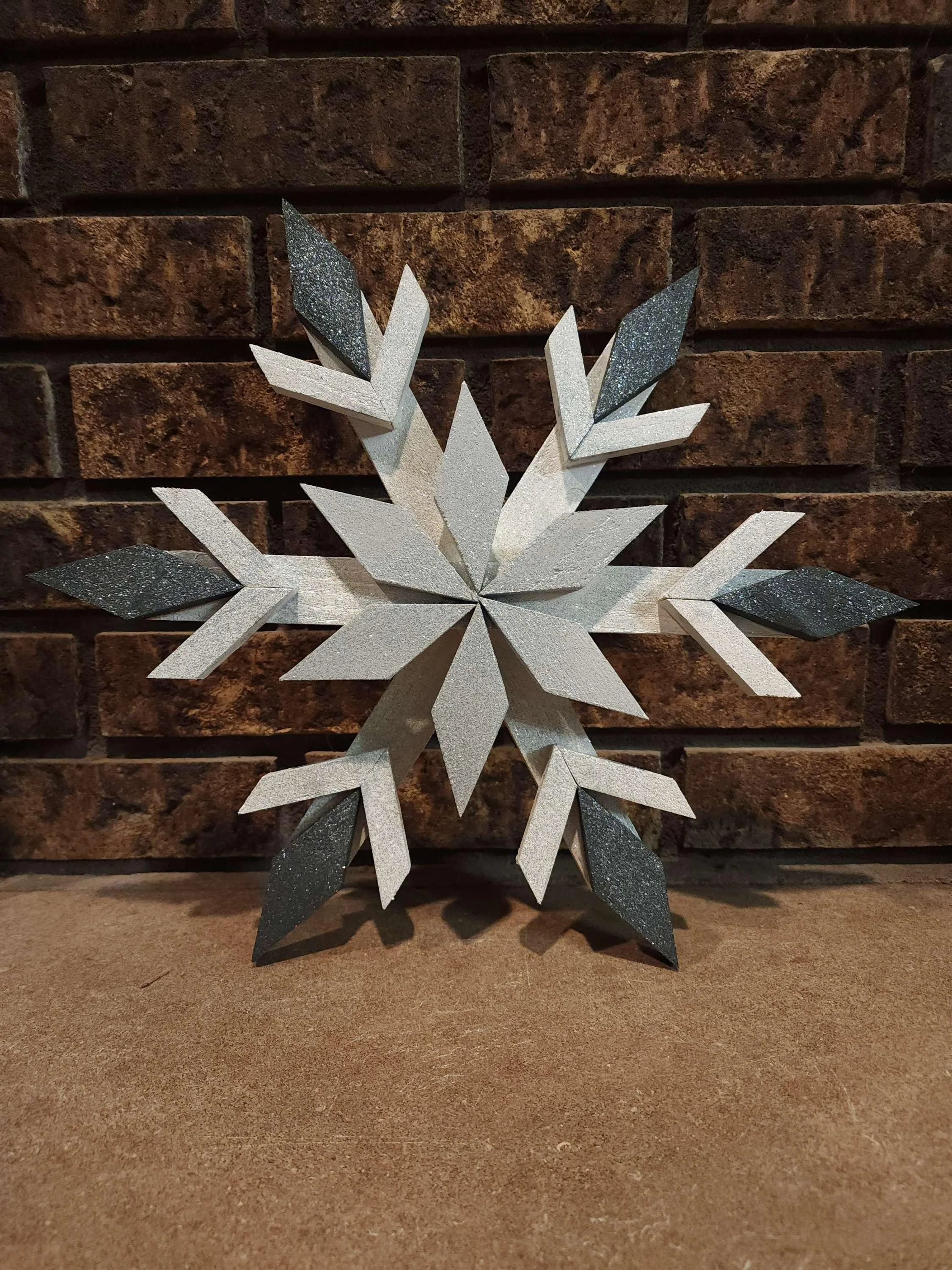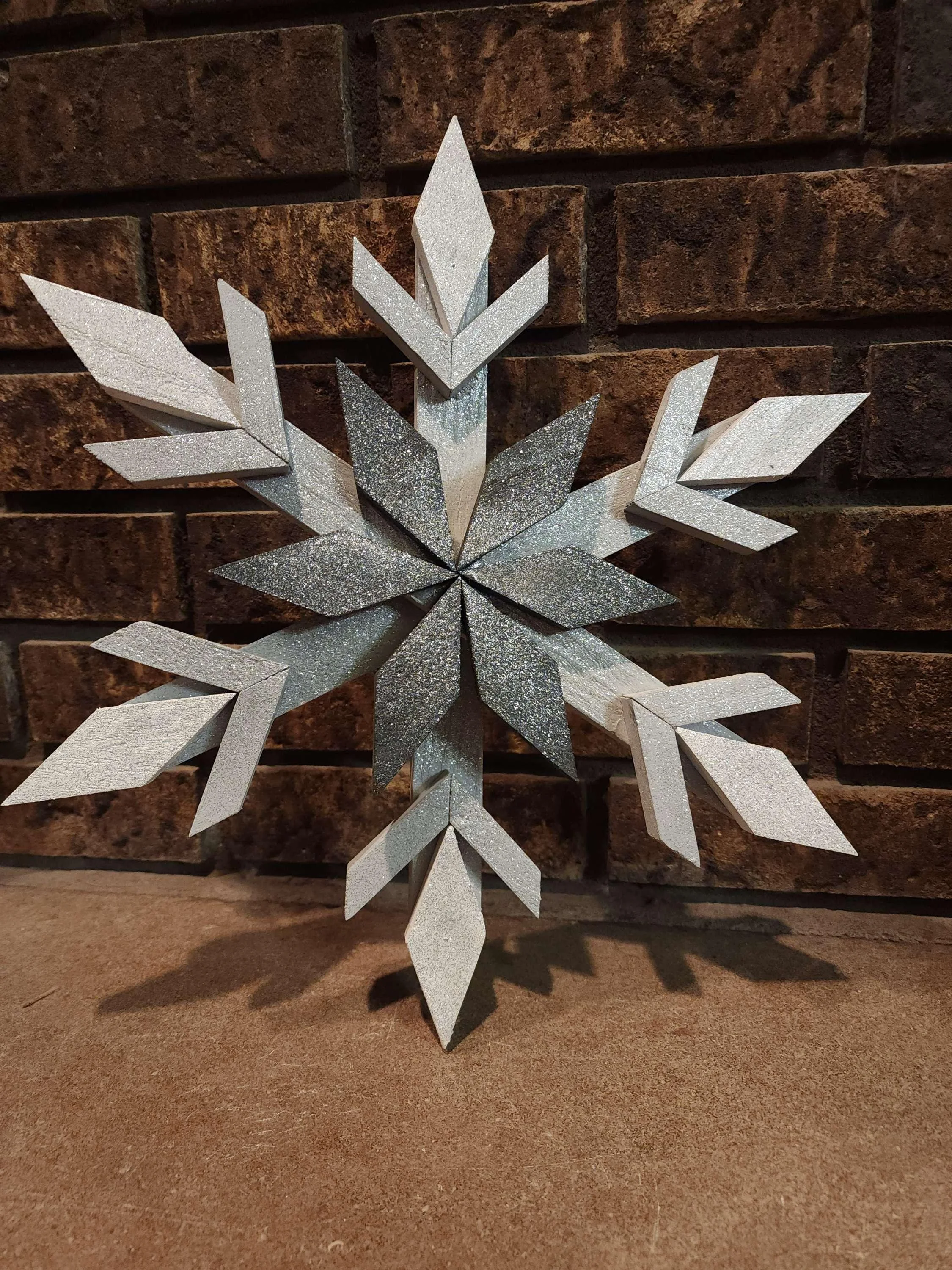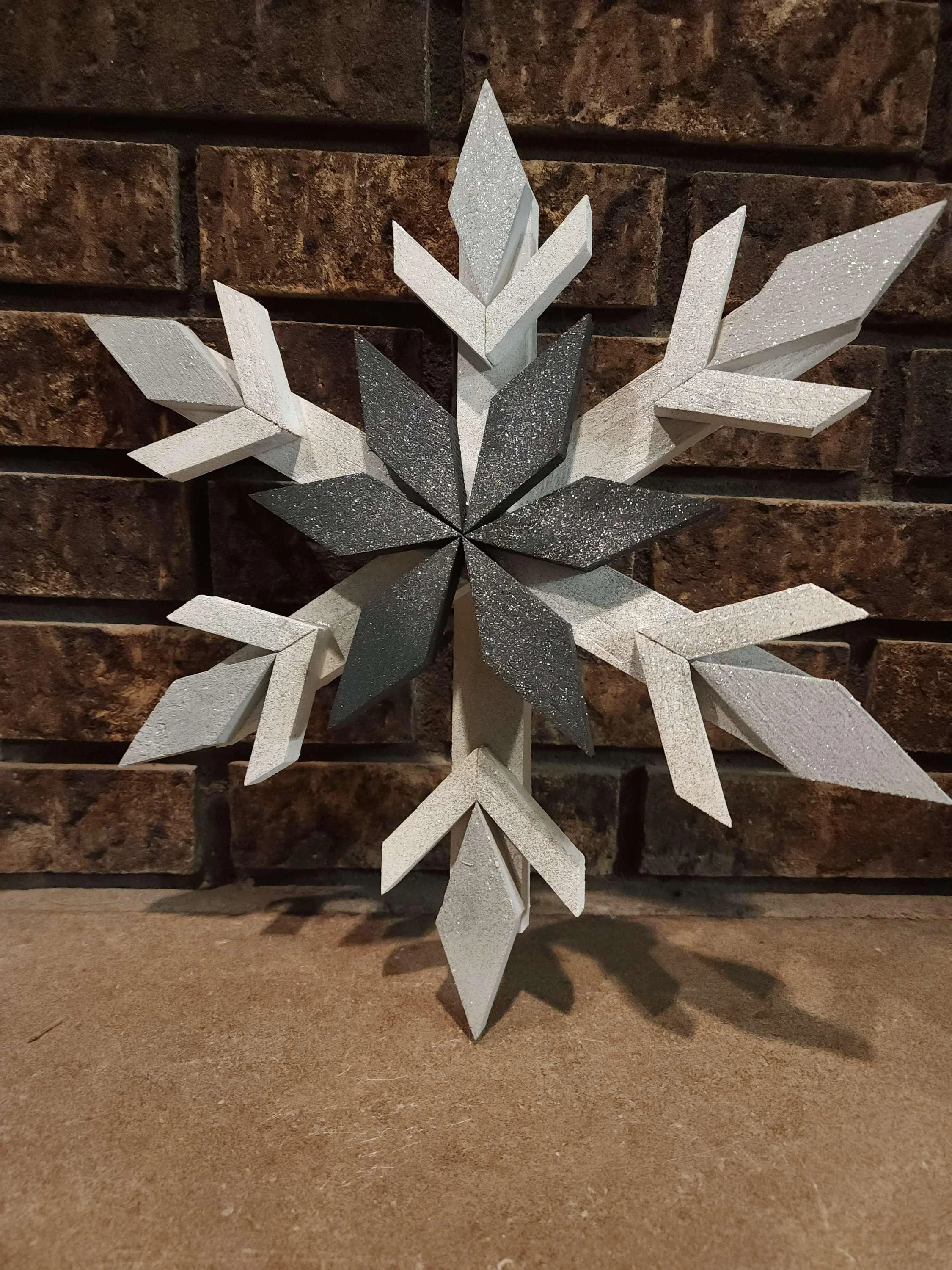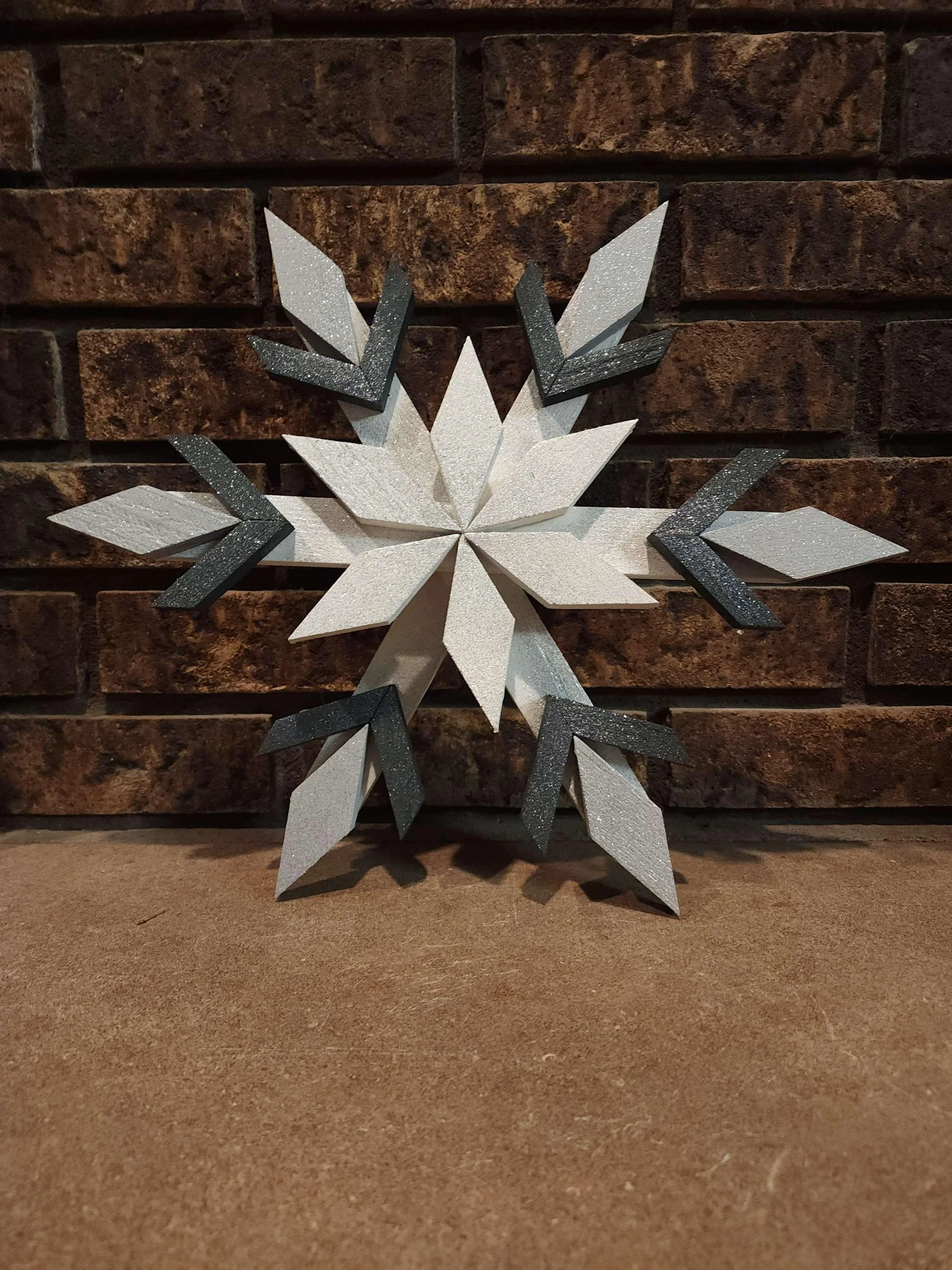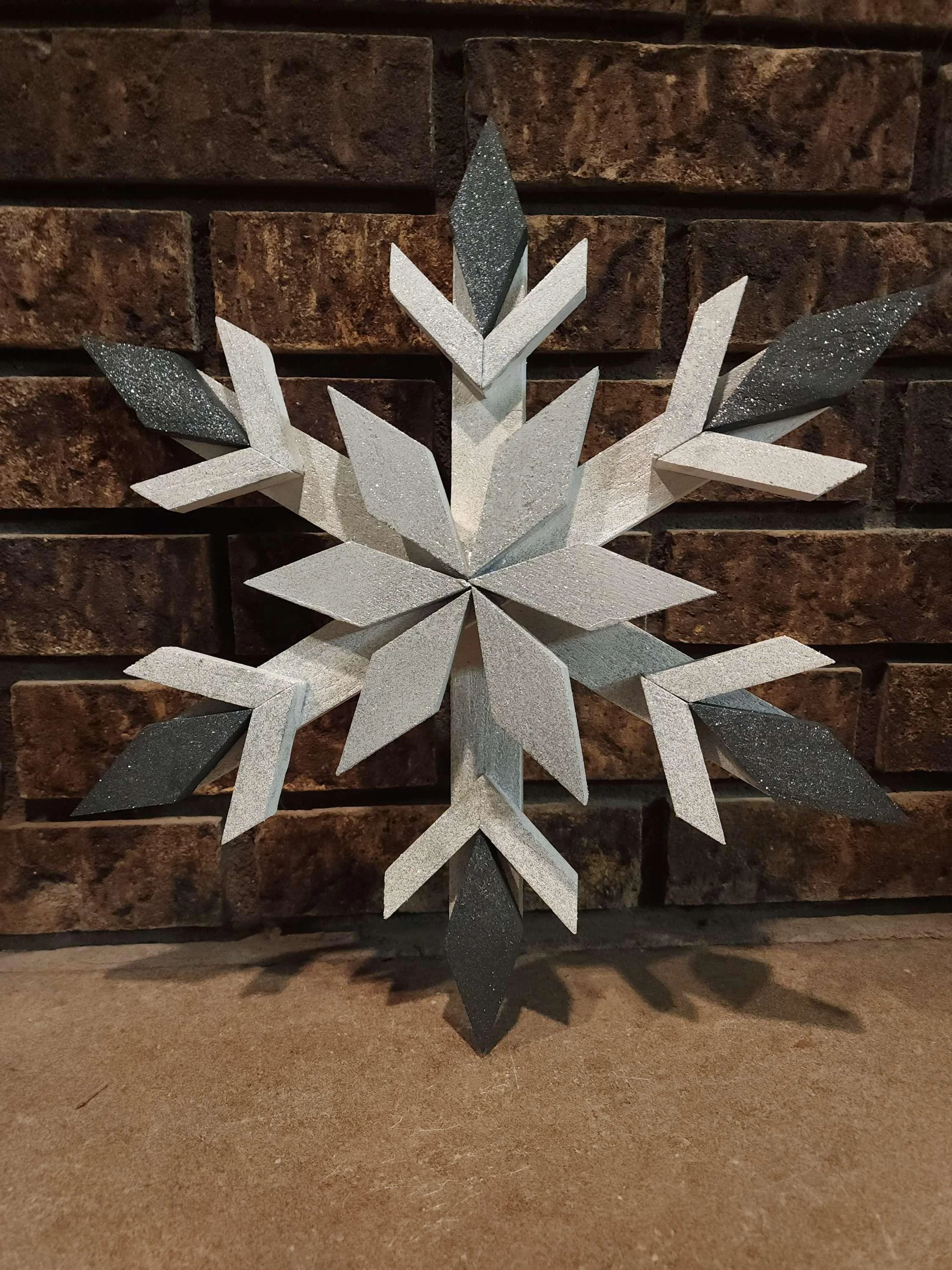 This Winter Geometric Snowflake Stands and Hangs at 16" Tall and 2" Thick. D Ring for hanging. A few patterns shades to pick from. Inquire about custom colors.