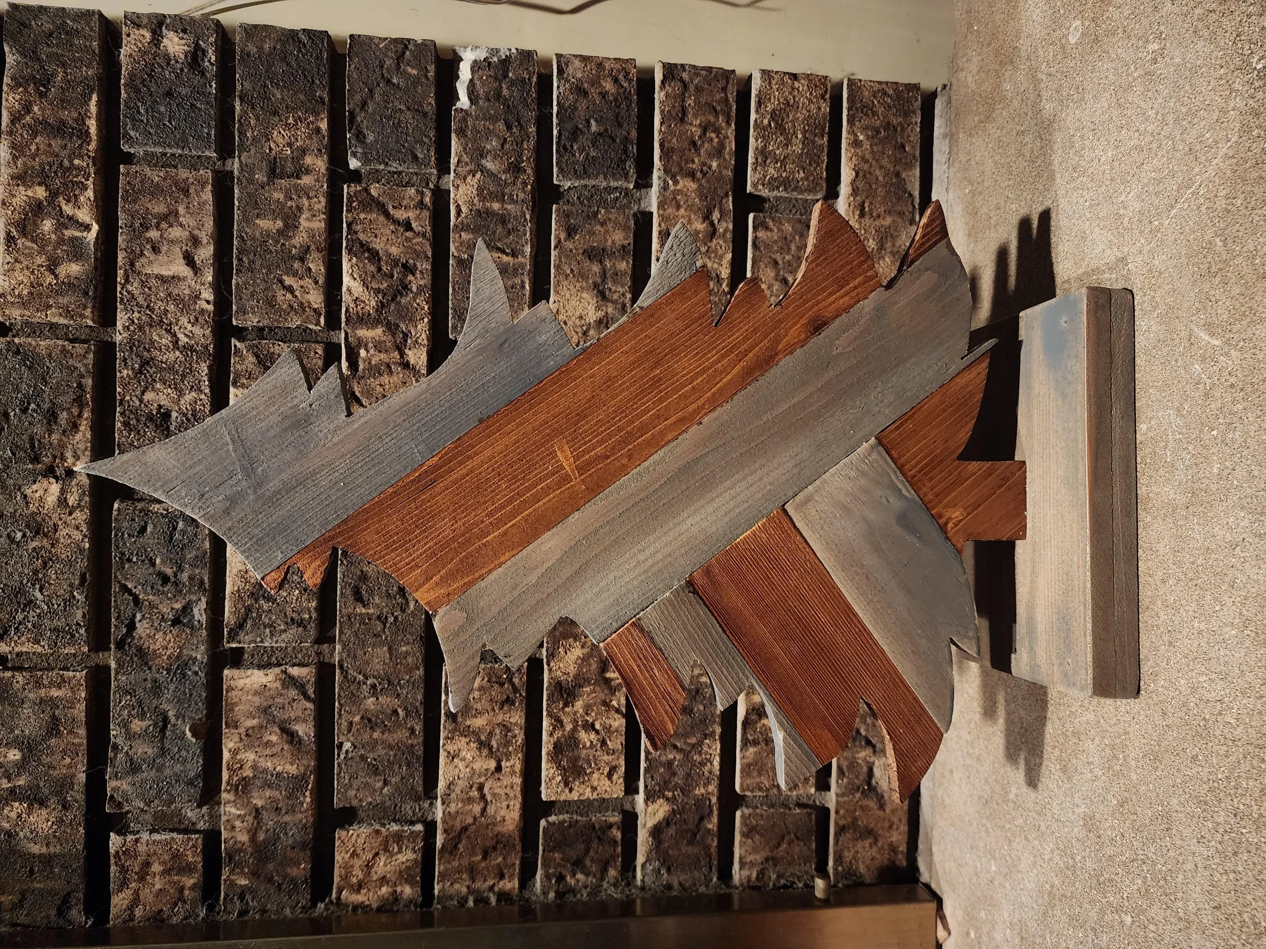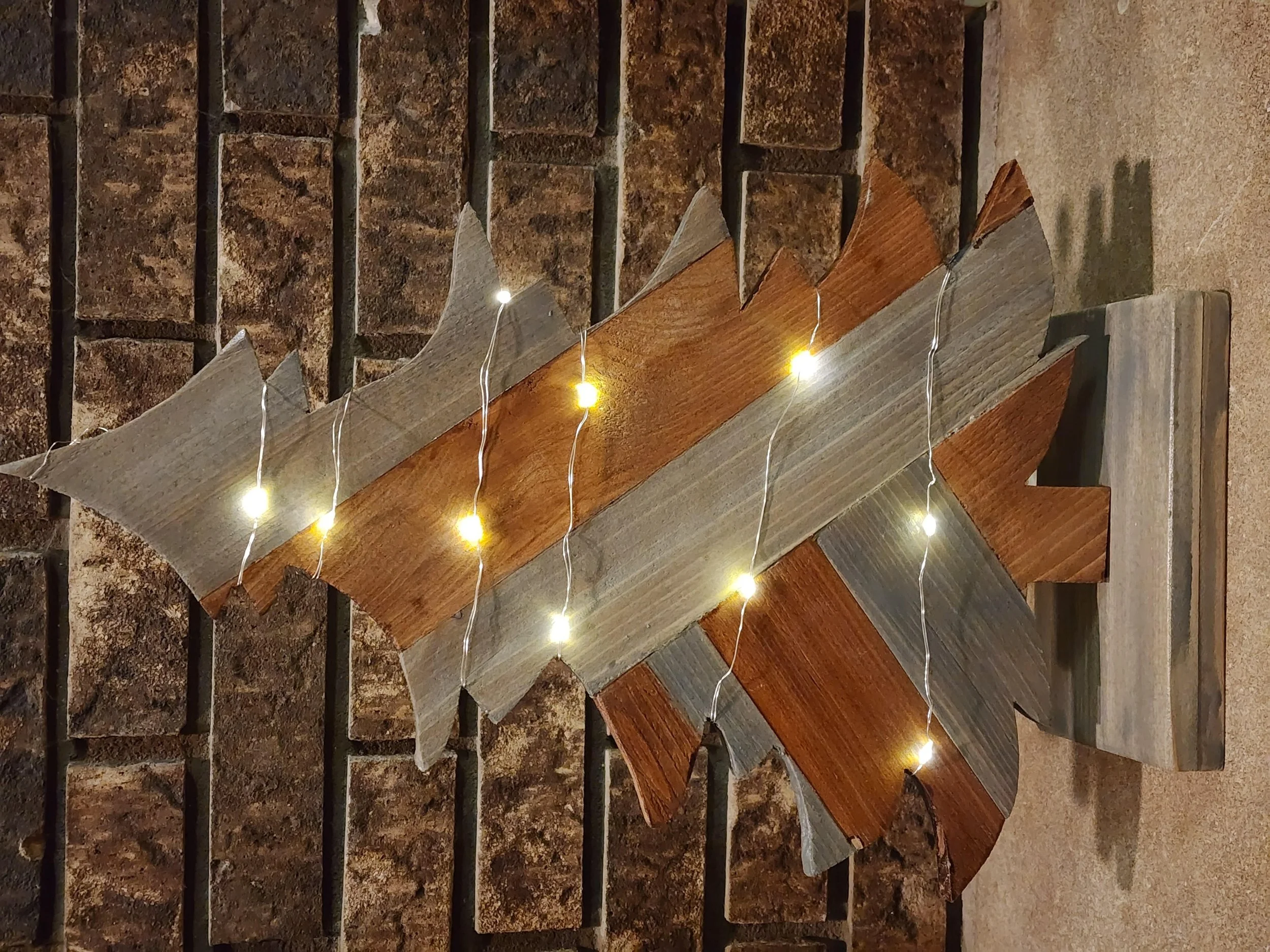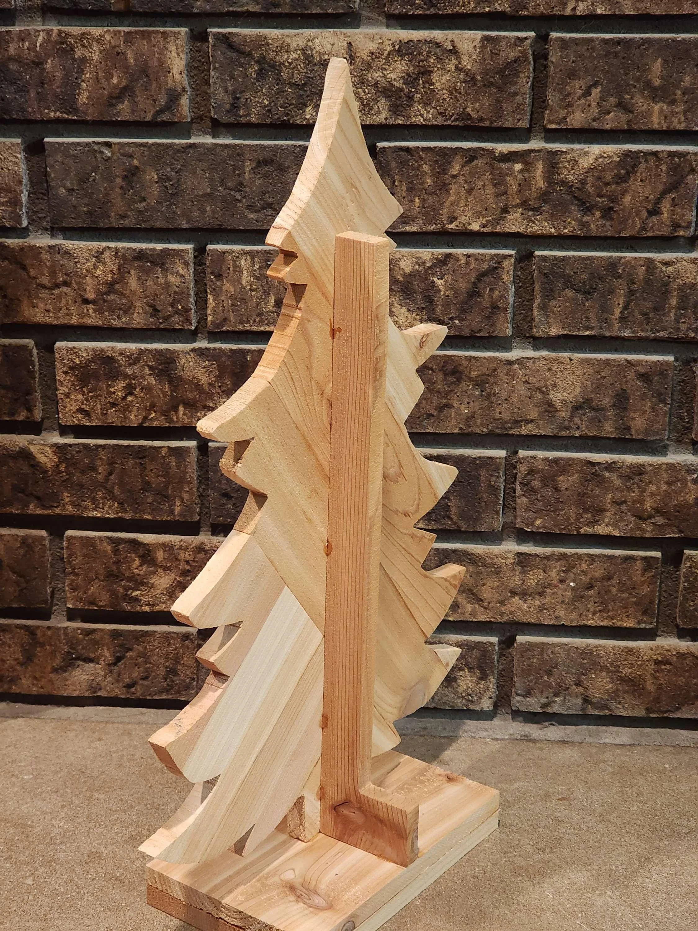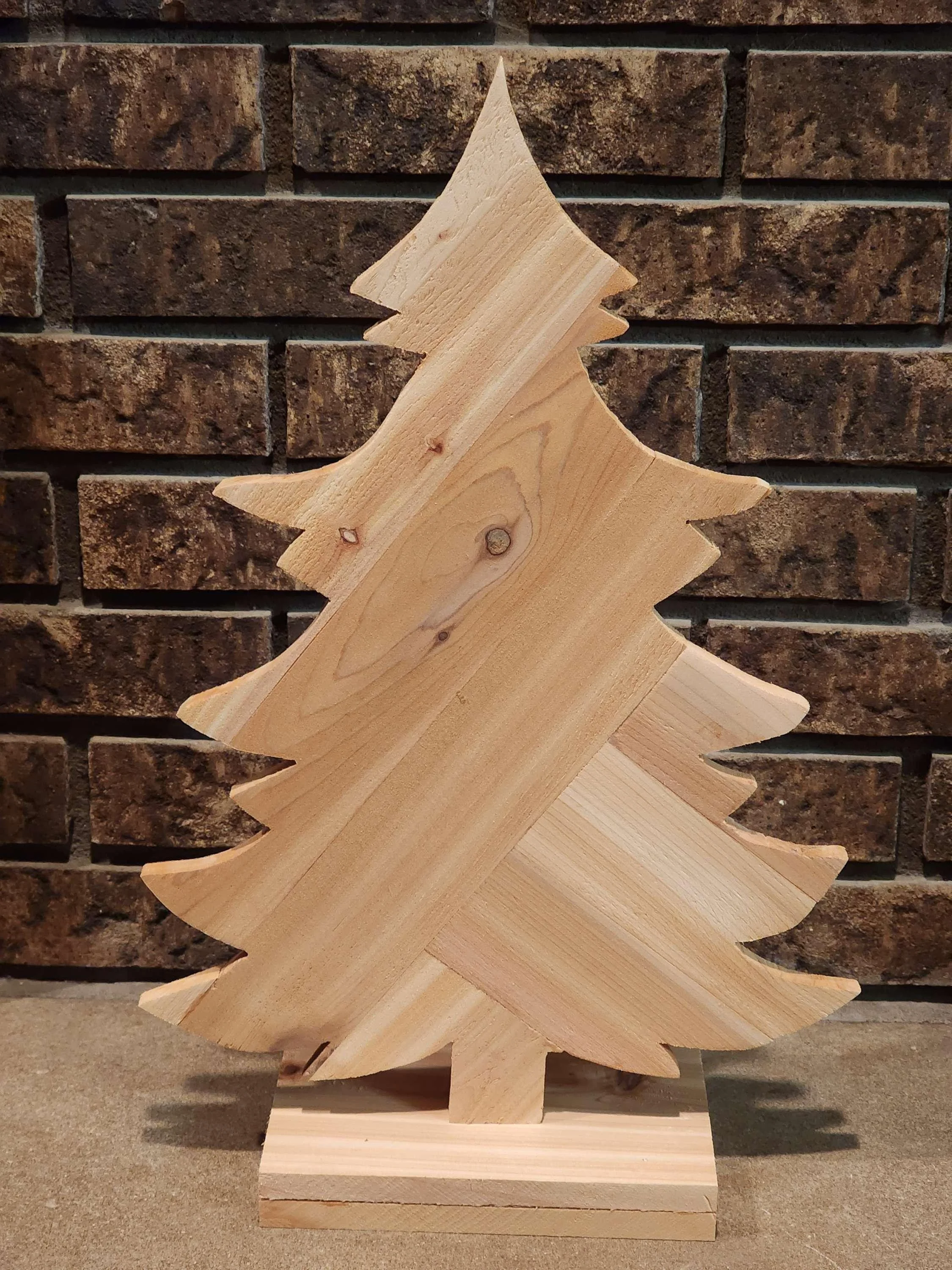 Wooden Rustic Christmas tree. Order yours. Official version coming soon. Official version will be stained. Each wood slate alternating between 2 colors. Stands about 21" Tall and 14" Wide. Sits on a base that is 5" Wide.